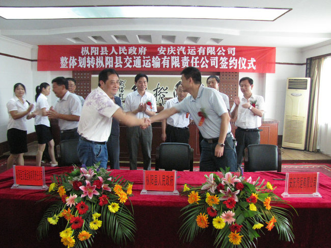 2011年9月1日,樅陽縣人民政府、安徽省交通集團安慶汽運有限公司整體劃轉(zhuǎn)樅陽縣交通運輸有限責(zé)任公司簽約儀式在樅陽迎賓館會議大廳內(nèi)隆重舉行。樅陽縣縣長何謙、副縣長胡海峰,省交通集團汽車運輸有限公司副總經(jīng)理方詩喬,安慶汽運有限公司董事長張進、黨委書記徐軍、副總經(jīng)理王中明、彭宏、紀委書記郭峰,樅陽縣交通運輸有限責(zé)任公司經(jīng)理童子健出席了簽約儀式。