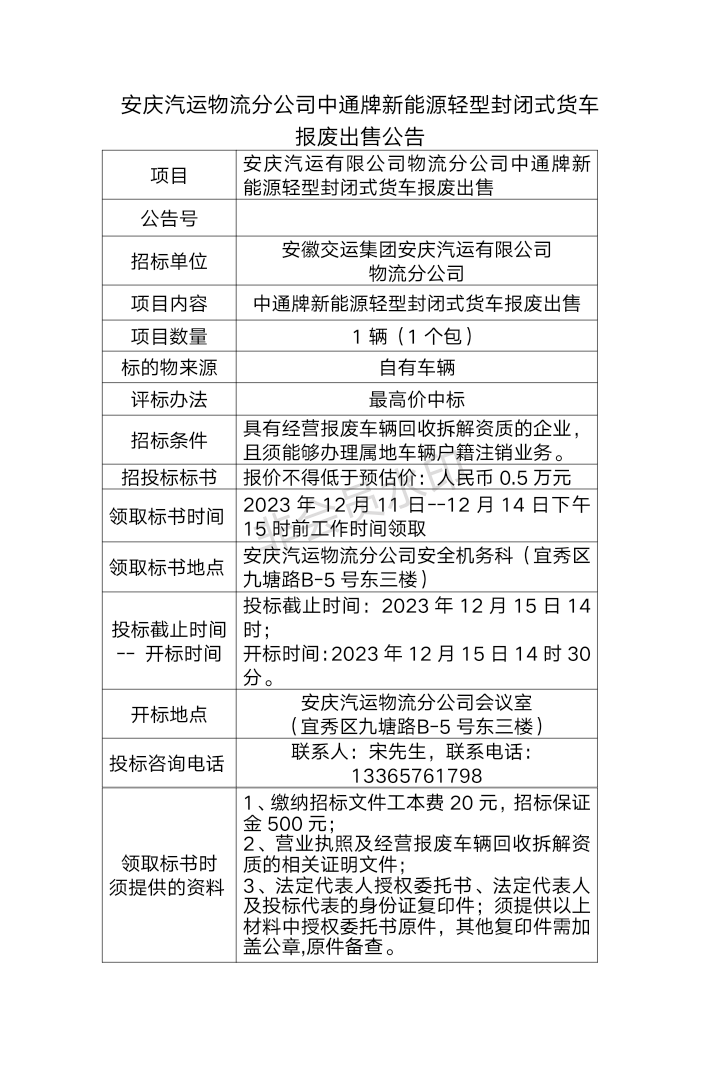 安慶汽運(yùn)物流分公司中通牌新能源輕型封閉式貨車 報(bào)廢出售公告